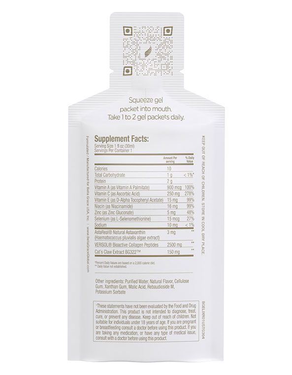 This unique focus of Bella Grace, the triple benefits of Verisol® Bioactive Collagen Peptides combined with AstaReal® astaxanthin and the botanical treasure, Cat’s claw is what sets Bella Grace Elixir apart. This exclusive formula approaches beauty from within from the perspective of superior science, with the best ingredients available that work in synergy to give you optimal skin health.